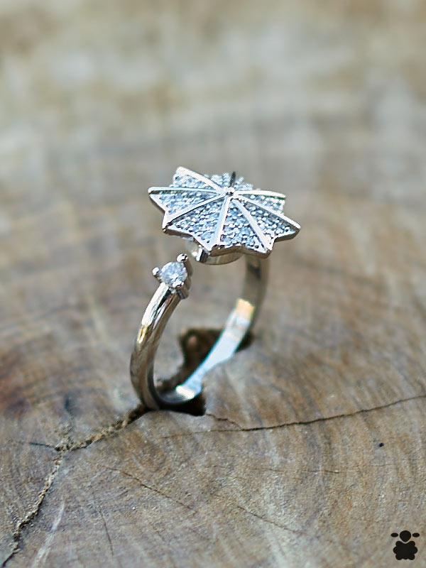 Una estrella mandala texturizada que parece irradiar energía positiva desde su centro, con un cristalito transparente que brilla en el extremo opuesto. Este anillo giratorio tiene ese aire místico y espiritual que funciona para todo y con todo.