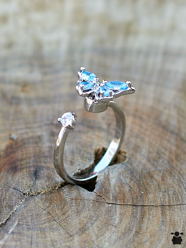 Cuatro cristales azules en forma de gota crean las alas de una mariposa perfecta, con un pequeño cristal transparente en el extremo opuesto que baila con la luz. Nuestro anillo bohemio tiene ese toque delicado y elegante que funciona casi con todo.