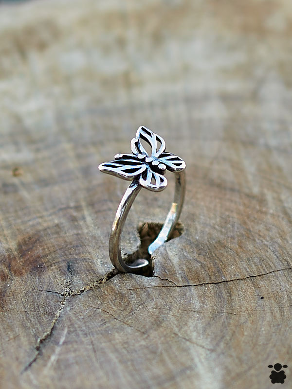 Una mariposa con las alas caladas que deja ver tu piel a través de ella. Y es que este anillo tiene ese aire vintage que parece sacado de otro tiempo pero funciona perfectamente hoy. Las alas están trabajadas con líneas delicadas que crean profundidad, y el acabado viejo le da ese toque oscuro que contrasta con las zonas pulidas.