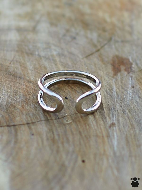 Lo bonito de este anillo es cómo los dos aros crean profundidad sin añadir peso. La plata pulida refleja la luz de forma preciosa, y las medias lunas parecen casi tocar pero nunca lo hacen del todo, dejando ese espacio que le da al diseño un aire ligero y respirable. Además, es sorprendentemente cómodo a pesar de ser un diseño doble.