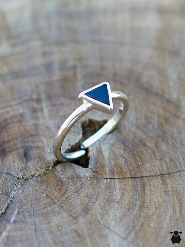 Un triángulo negro esmaltado sobre un aro fino de plata. Nada más. Y es que a veces lo más simple es lo que más funciona. Este anillo bohemio tiene ese rollo geométrico minimalista que va con todo.