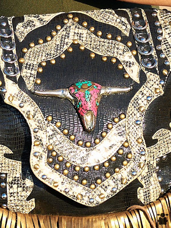 Bolso bohemio piel negro hecho a mano: franjas beige, flecos dorados y cabeza búfalo rosa-turquesa con pedrería. Elegancia rebelde.