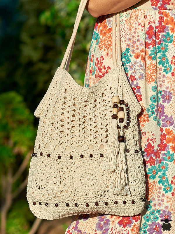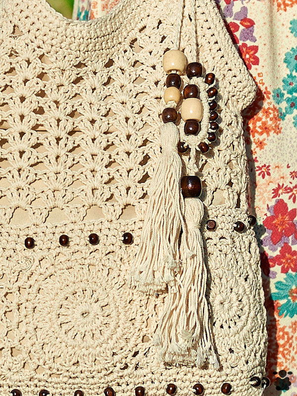 Bolso de estilo boho chic trenzado en macramé en color beige. Un diseño precioso con un forro interior de tela con cierre. Incluye detalles étnicos: cuentas de madera, pompones. Combina muy bien con vestidos boho, pantalones cortos, vaqueros, es un bolso todo muy versátil.