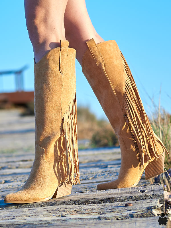 Botas altas boho con flecos para mujer en color camel, con aires western y tiradores en lo alto de la caña. Su tacón ancho de 7 cm nos da estabilidad y un plus de altura, además de muchísima comodidad. Este calzado es ideal para completar tus looks bohemios, camperos y hippie chic.