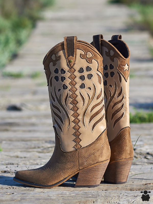 Botas altas boho-camperas para mujer en color camel-beige con dibujos en la caña. De estética western, reinventadas para aportar más valor a nuestros atuendos; hemos añadido detalles que las hacen aún más especiales. Por su tacón sensato, su versatilidad para combinar tanto con vestidos como vaqueros y faldas, por su capacidad para estilizar las piernas, son una apuesta segura.