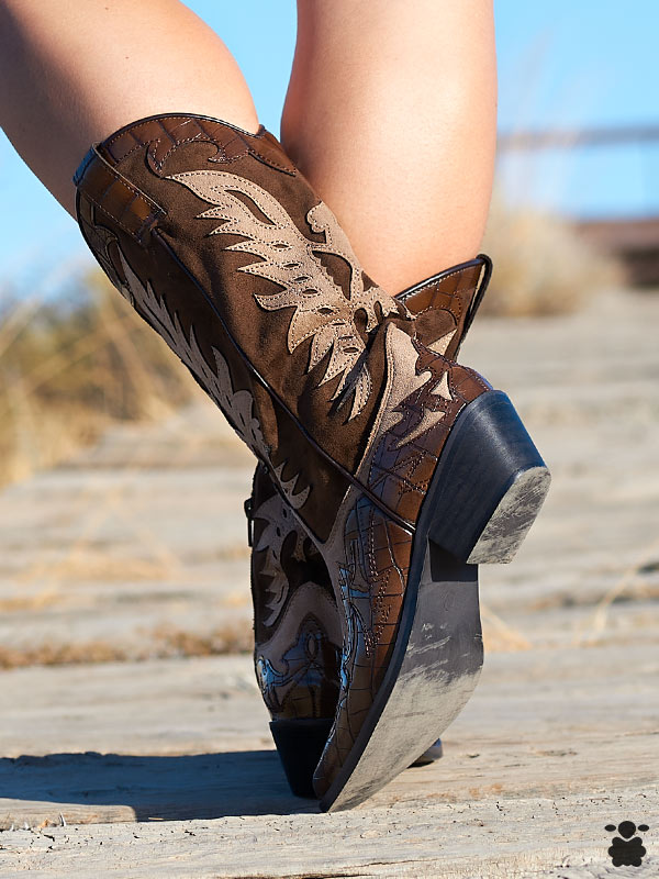 Botas altas camperas en color café y beige con dibujos en la caña. Estas botas camperas cowboy son cómodas, ideales para otoño-invierno, su tacón de 5 cm le da estabilidad y elegancia, ideales para esta nueva temporada de donde las botas y botines camperos siguen en tendencia..