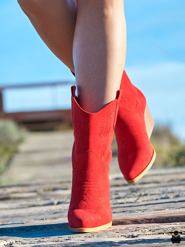 Botas camperas rojas con tacón para mujer de caña media, bordados y decorados camperos en la caña y en el empeine. Su tacón ancho de 7 cm nos da estabilidad y ese plus de altura que tan bien nos viene. Este calzado es ideal para completar looks vaqueros, camperos y boho chic.