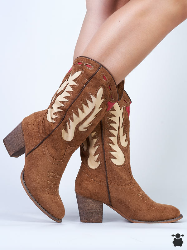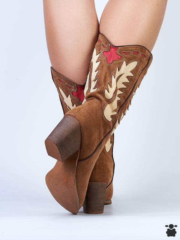 Botas camperas de caña alta para mujer en color marrón con efecto antelina. Con bordados y dibujos en la caña, estas botas altas de estilo campero son ideales para tus looks cow-boy.