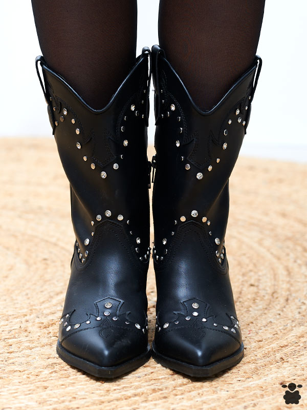 Botas altas estilo cowboy en piel vegana negra con tachuelas plateadas y brillantes incrustados. Punta fina, bordados western, tacón cubano 7 cm, cremallera lateral. Ideales para looks festivaleros, country chic o noches con rock and roll.