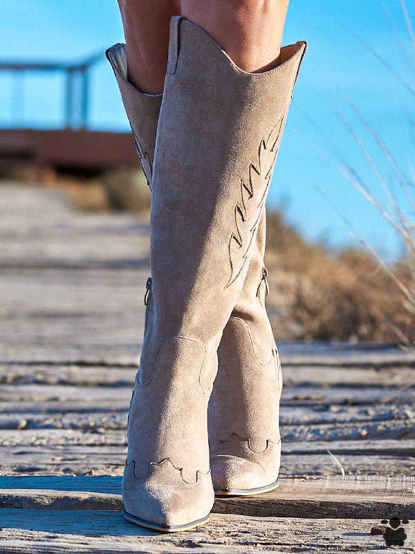 Botas cowboy para mujer en color arena-kaki, con bordados western en el empeine y la caña. Estas botas vaqueras son ideales para combinar con vaqueros o vestidos para un look casual y atractivo. El modelo Teruel es perfecto para conjuntar con diferentes atuendos, ya que el tono beige-arena es fácil de combinar con diferentes colores y estilos.
