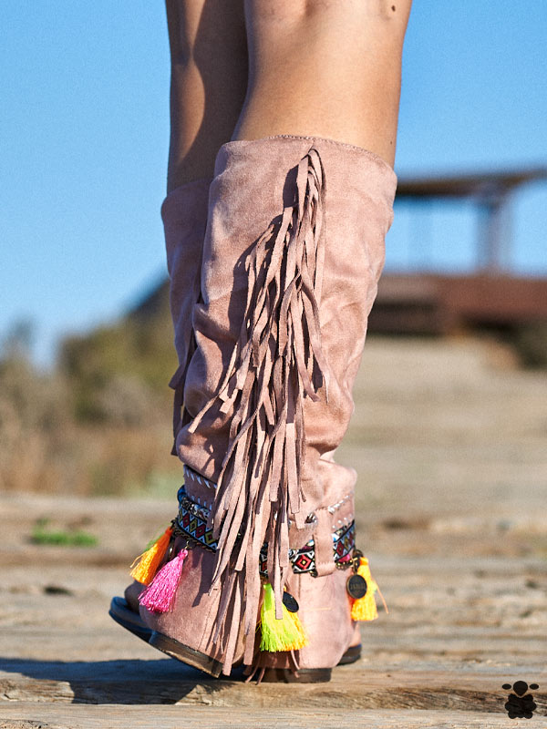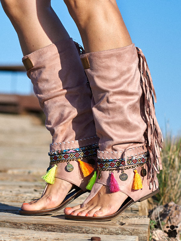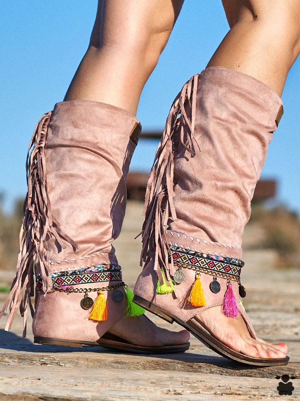 Calzado hippie de caña alta en tono rosa, adornado con pompones multicolores, detalles de monedas y flecos móviles. Confecionado en material textil con plantilla acolchada para máximo confort en uso prolongado.