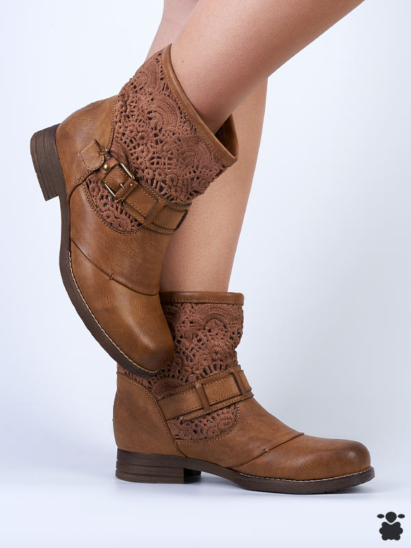 Botines camperos para mujer en color camel. Con bordados en la caña, aire y corte boho-campero; ideales para tus looks boho-chic.