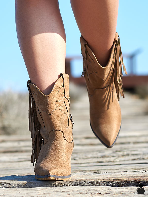 Botines boho chic con flecos en color camel. Estos botines baratos estilo cowboy son cómodos, calentitos, vienen con flecos y dibujos camperos en la caña, su tacón de 7 cm le da elegancia y estiliza la pierna. Con estos botines camperos podrás conjuntar multitud de atuendos, son tan válidos para una ocasión especial como para ir guapa a la oficina.