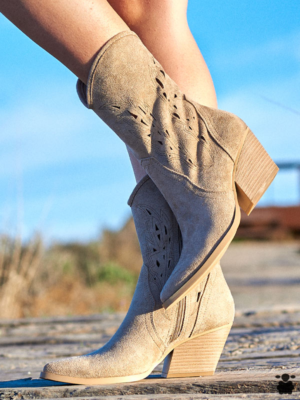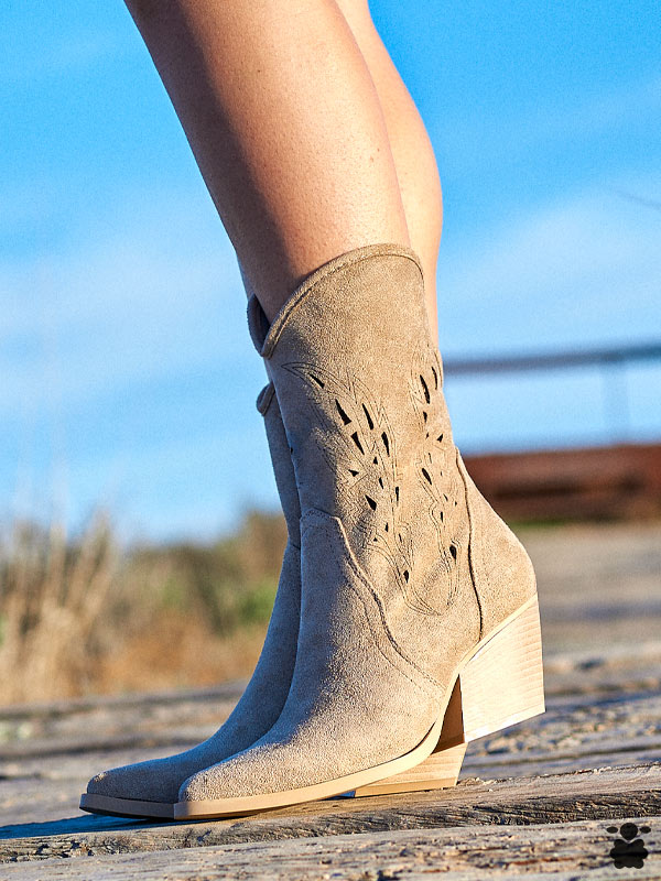 Botines bohemios de mujer en color beige de estilo campero. Este modelo de botín con tacón bautizado como ‘Luca’ viene con la caña troquelada o calada, con punta fina, con un tacón ancho de 6,5 cm, dándole un poco de altura, estabilidad y estilo a tu silueta. Es un calzado ideal para primavera-verano ya que vienen con detalles perforados en la caña.