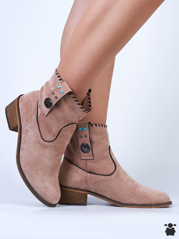 Botines camperos boho chic para mujer con efecto serraje en color rosa. Detalles bohemios en la caña, tachuelas plata y de color turquesa. Combinan genial con mini-vestidos, vaqueros, etc.
