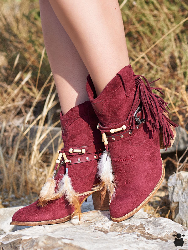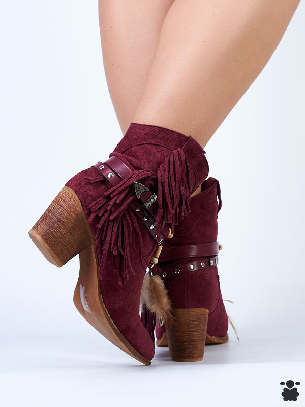 Botines camperos bohemios para mujer con efecto serraje en color burdeos. Detalles boho chic en el cinturón: plumas, flecos, tachuelas, piezas étnicas. Perfectas para tus looks bohochic o cowboy.