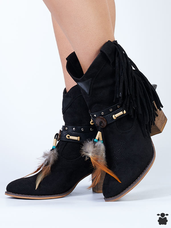 Botines camperos bohemios para mujer con efecto serraje en color negro. Detalles boho chic en el cinturón: plumas, tachuelas, flecos, piezas étnicas. Complemento imprescindible para tus conjuntos boho – camperos.