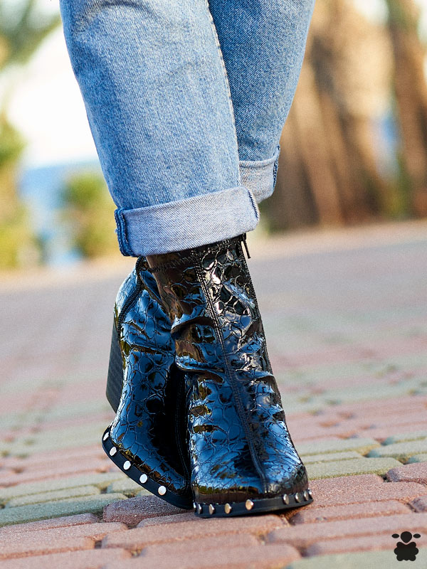 Botines tobilleros de estilo campero en efecto charol negro brillante. Punta fina, tachuelas metálicas en puntera y contorno, tacón cubano de 7 cm y cremallera lateral. Perfectos para looks rockeros o noches con actitud.