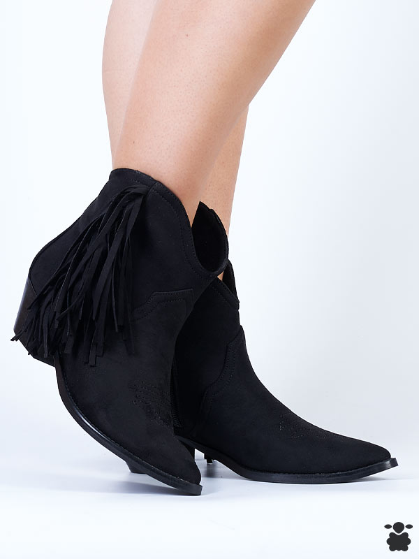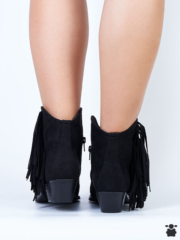 Botines camperos para mujer en color negro. Detalles boho chic en la caña: flecos. Estas botas de estilo campero tienen un aire cow-boy, ideales para tus looks boho chic.