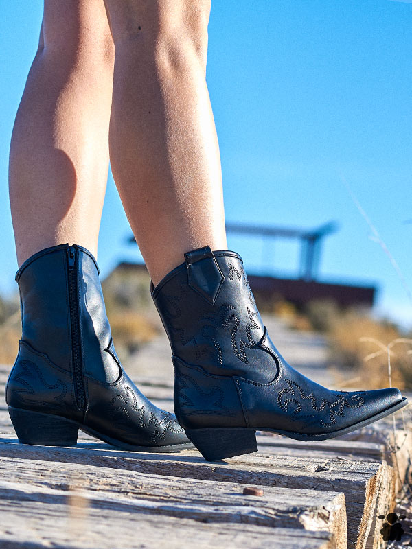 Botines cowboy Plazanorte negro para mujer con costuras vaqueras y tirador lateral: estilo western bohemio atemporal con tacón bajo para comodidad diaria.