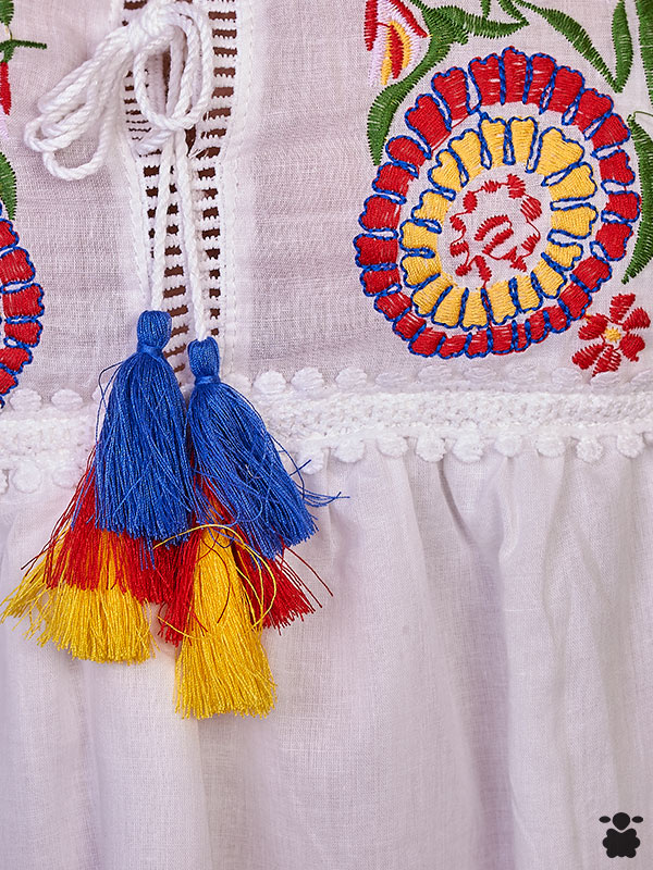 Camiseta blanca boho con bordados, cierre con cordones, flores bordadas en el pecho y pompones de colores.