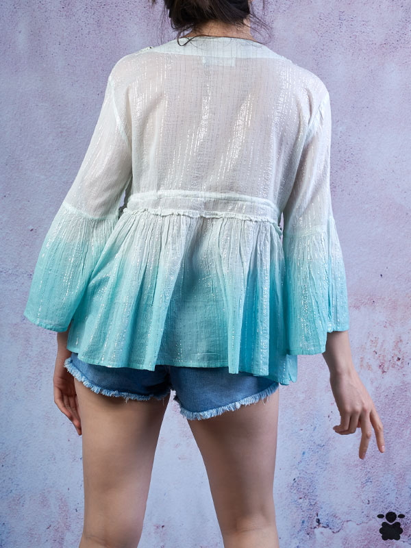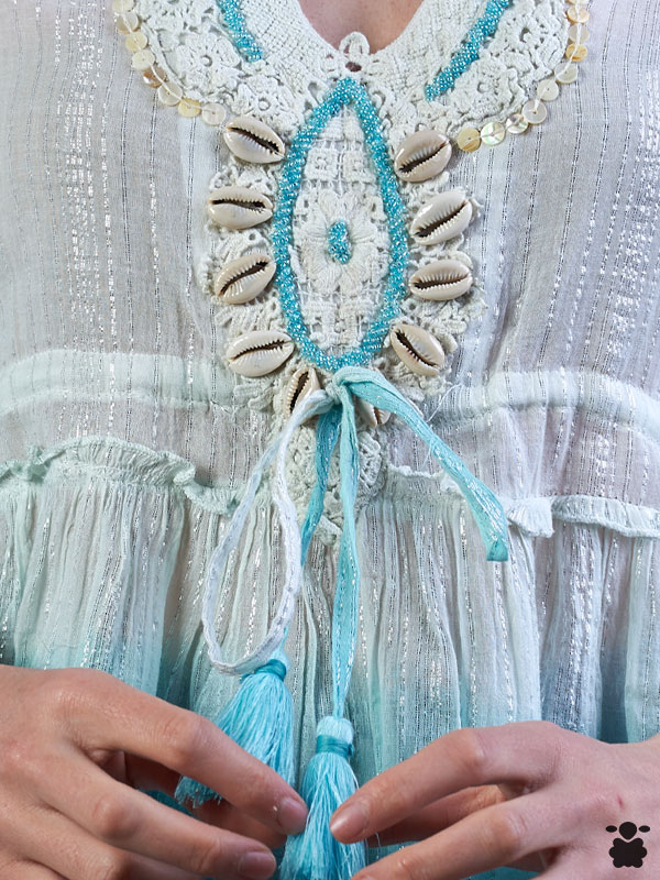 Camiseta boho con caracolas para mujer en color azul y blanco; ideal para los días de primavera verano.