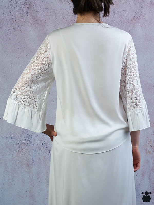 Camiseta boho blanca y dorada, mangas acampanadas, lentejuelas en el pecho, cordones con plumas, tachuelas, pompones.