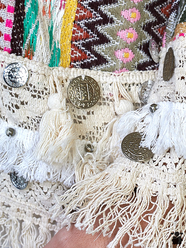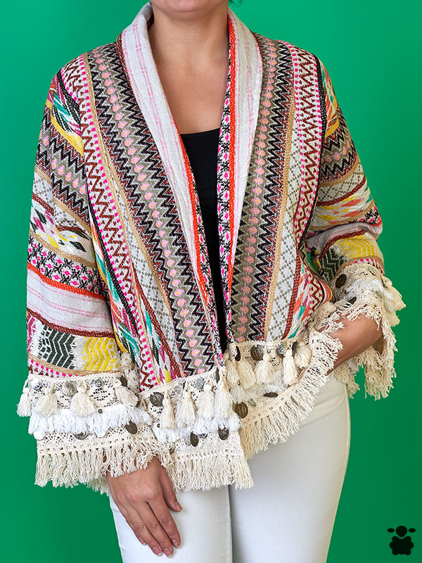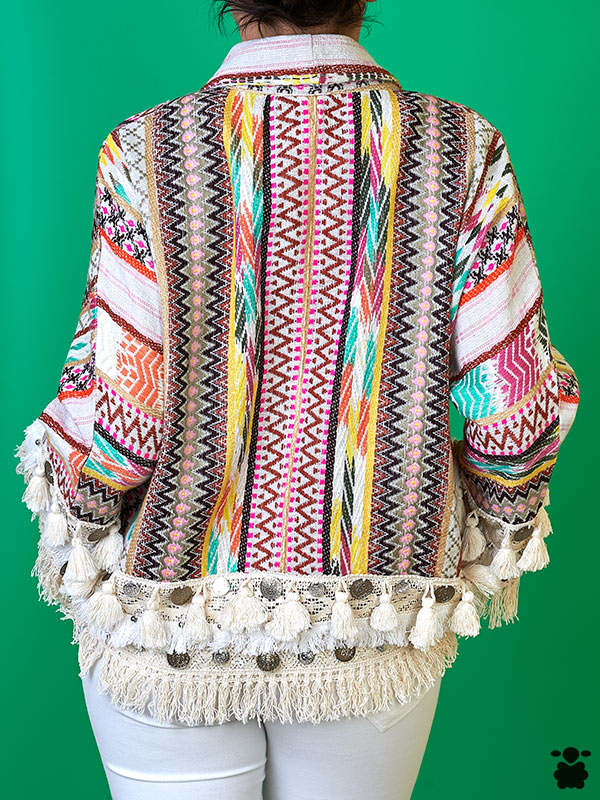 Chaqueta boho grecas con adornos en mangas y cadera.