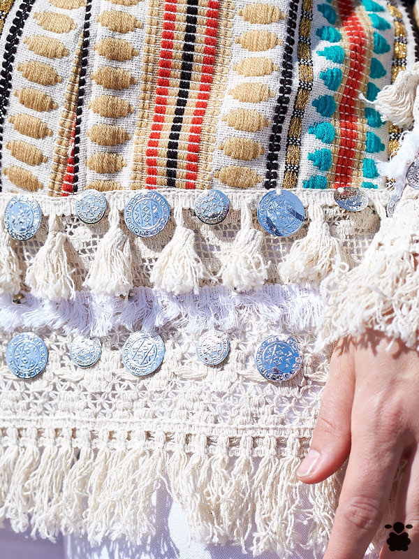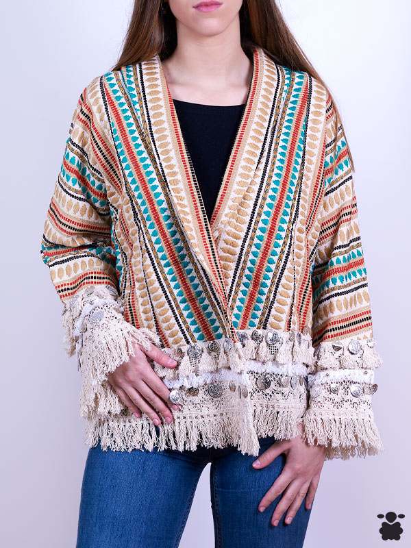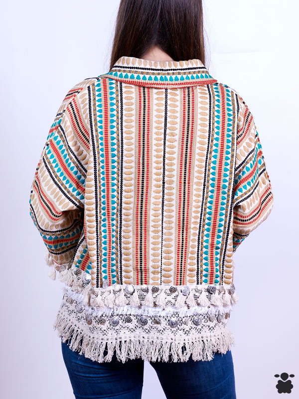 Chaqueta boho Quebec con adornos en mangas y cadera: monedas y bordados.
