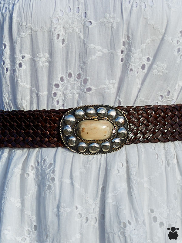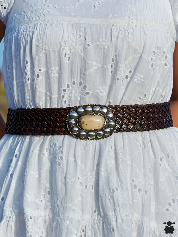 Cinturón para mujer de cuero trenzado marrón con hebilla ovalada con pedrería incrustada en color hueso. Es un producto de origen artesanal, hecho a mano adaptable a cualquier medida por su sistema de enganche en cualquier punto del trenzado del cinturón.