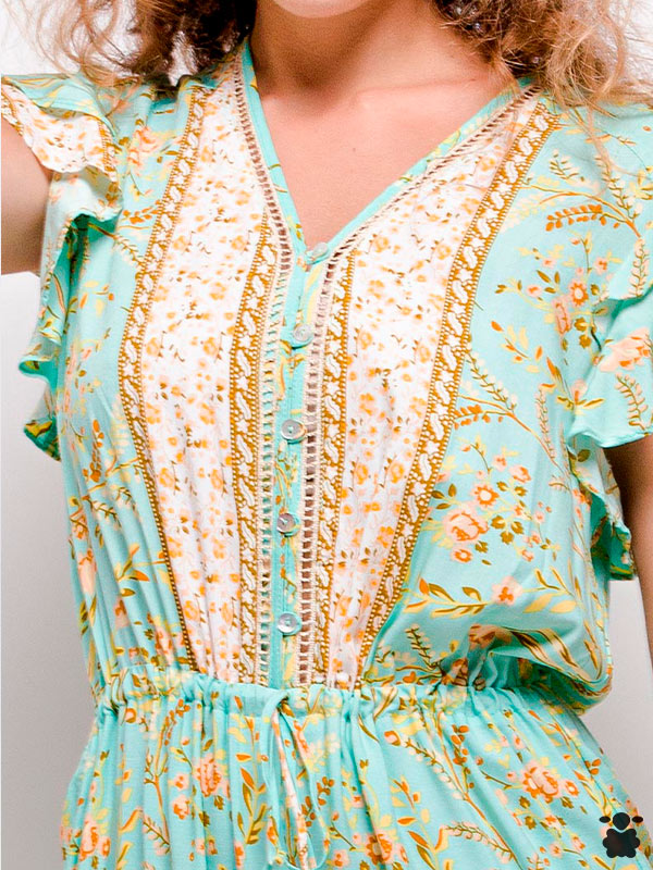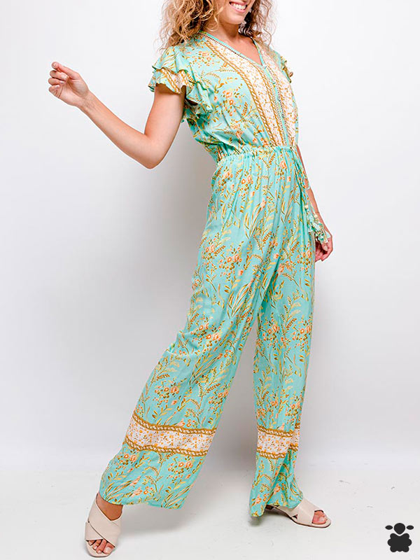 Mono boho chic estampado para mujer, de manga corta, escote de pico cerrado con botones y detalles dorados. Lazos para ajustar la cintura.