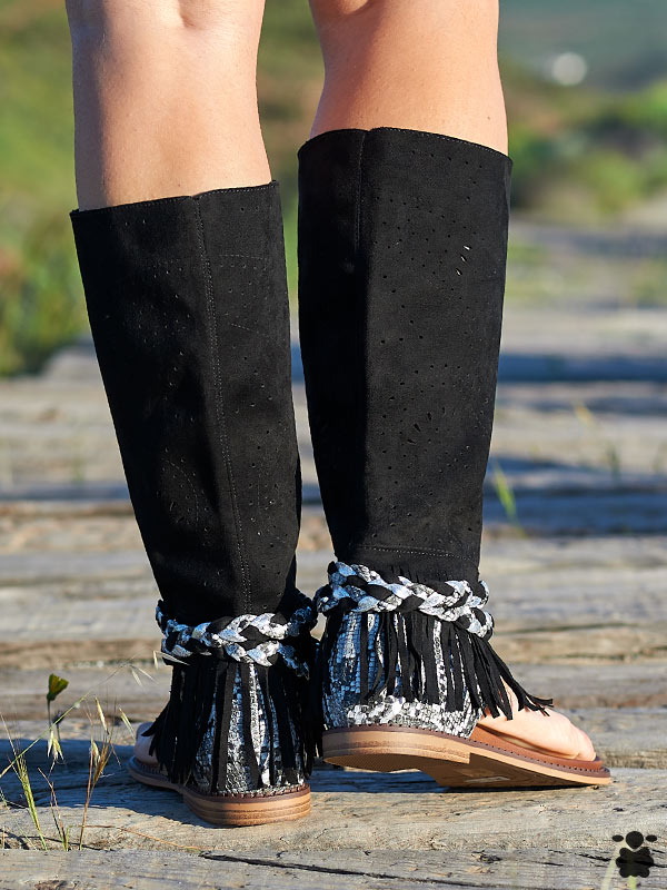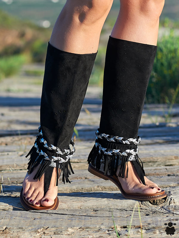 Sandalias altas boho chic en color negro para mujer con efecto antelina y calados en la caña. El modelo Coracao incluye un cinturón de inspiración étnica, flecos y talón de animal print. Plantilla acolchada, muy cómodas. Un complemento perfecto para cualquier look bohemio.