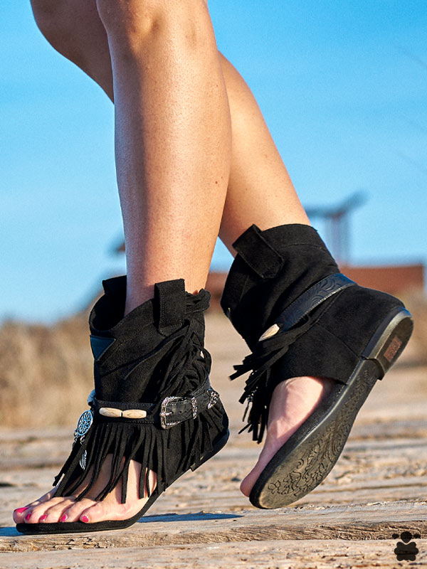 Sandalias ibicencas negras con atrapasueños, flecos largos y cinturón ajustable con piezas de madera talladas a mano. Un diseño boho chic refinado, místico y lleno de movimiento, perfecto para completar tus looks veraniegos.
