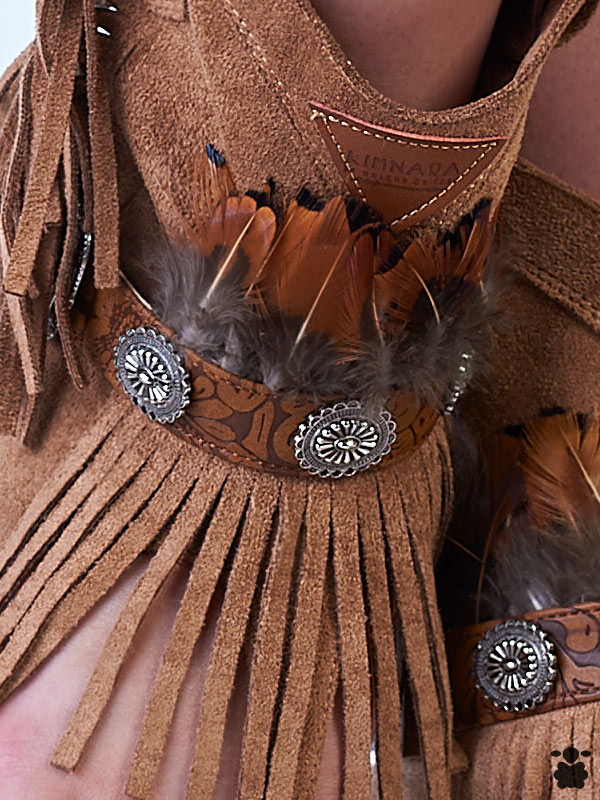 Sandalias boho chic con plumas y flecos en color camel para mujer con efecto ante. Cinturón extraíble de inspiración bohemia con hebilla de metal, adornos: chapas, plumas. Ideales para nuestros outfits más bohochic.
