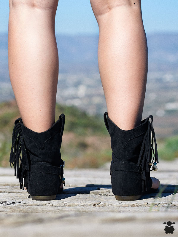 Sandalias boho chic en color negro para mujer con efecto antelina. Cinturón-Cubre botas de inspiración bohemia con caracolas, abalorios de madera, flecos, pedrería, tachuelas. El modelo Valhalla es el complemento ideal en cualquier look hippie-chic.