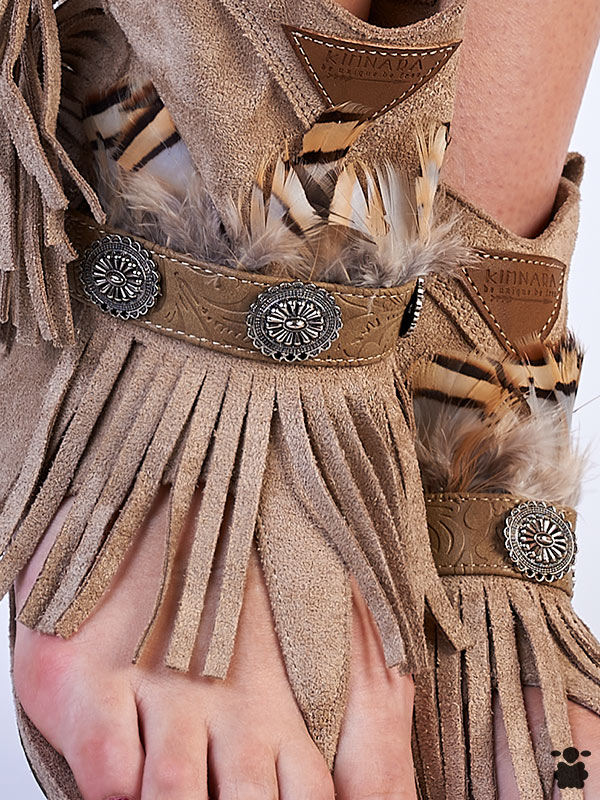 Sandalias boho chic con plumas en color beige-taupe para mujer con efecto ante. Cinturón extraíble de inspiración boho-étnica con hebilla de metal, adornos: chapas, plumas. Ideales para nuestros outfits más bohochic.