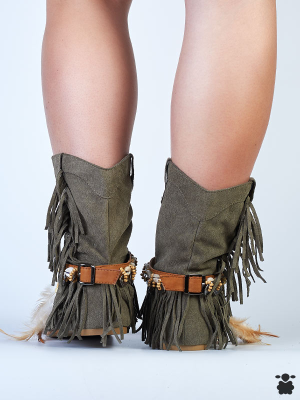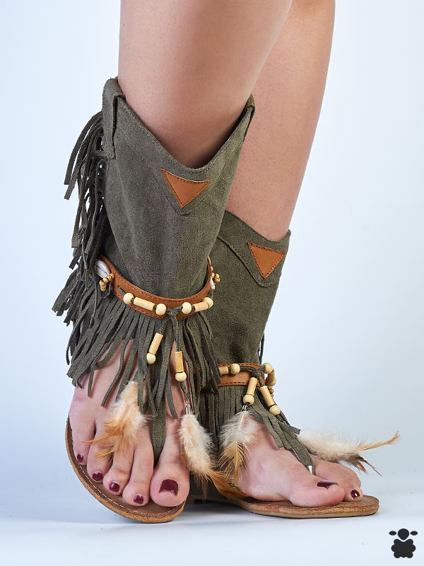 Sandalias boho chic en color verde para mujer con efecto antelina. Cinturón extraíble de inspiración bohemia con hebilla de metal, adornos: chapas, plumas, caracolas, flecos. Ideal para completar tu a atuendo boho chic.