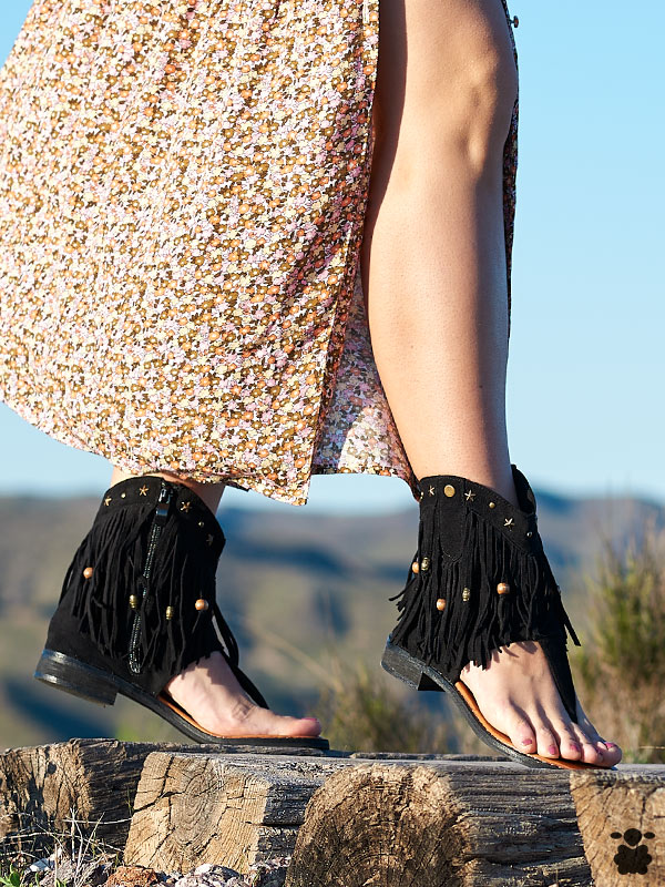 Sandalias con flecos de estilo boho en color negro para mujer con efecto antelina. Incluyen abalorios y elementos de inspiración étnica: flecos, tachuelas, estrellas, piezas de madera. Cierre con cremallera, plantilla acolchada, muy cómodas. Un complemento perfecto para cualquier look hippie-chic.