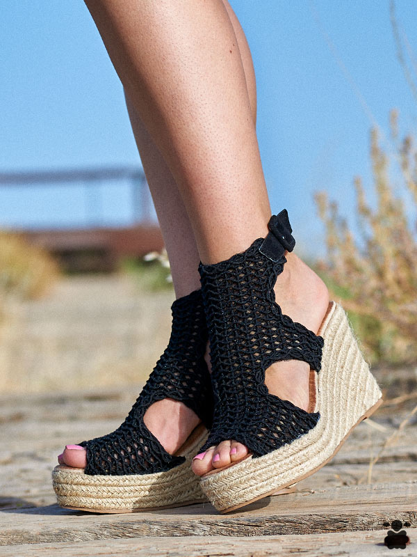 Sandalias con plataforma alta en color negro hechas en croché, cómodas y de moda, con plantilla acolchada. Son unas cuñas boho perfectas para el uso en la temporada de primavera verano. Este modelo de calzado de esparto está disponible en nuestra tienda en dos colores.