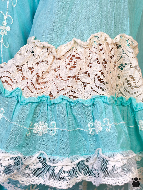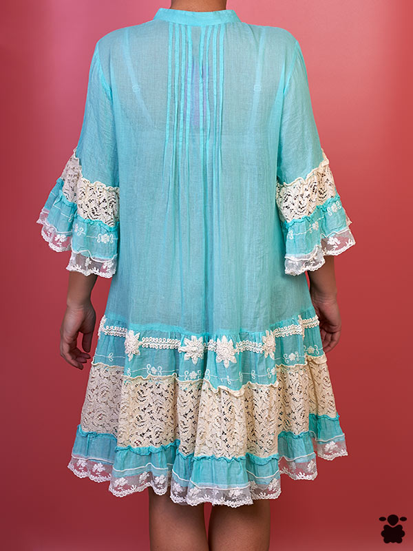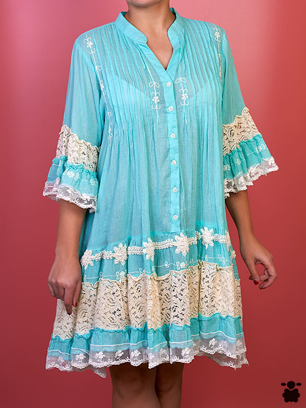 Vestido boho chic en color azul celeste con bordados en color blanco, cuello mao y detalles étnicos.