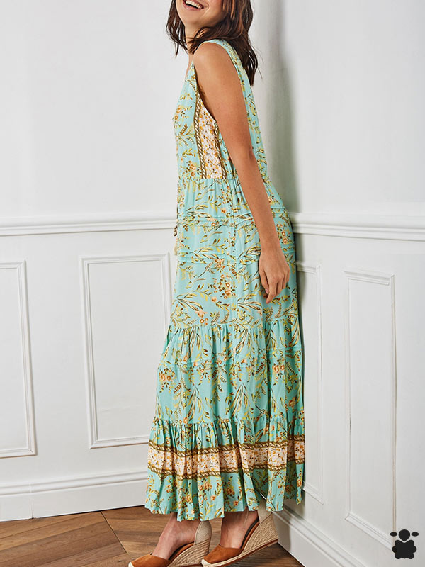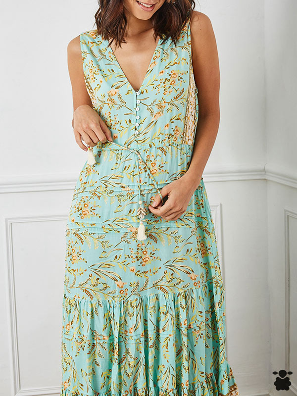 Vestido largo bohemio de color verde y estampado bohemio con botones en la parte delantera y abertura.