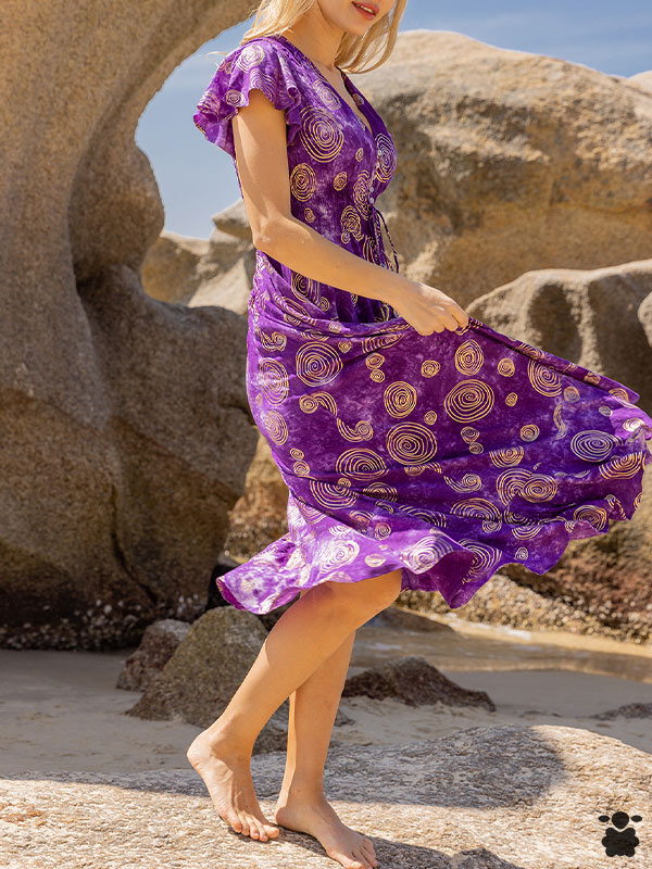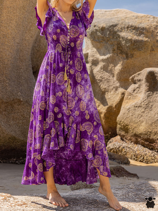 El Vestido Boho Ciclo Morado es ideal para ocasiones informales o eventos más formales, adaptándose perfectamente a tu estilo personal.
