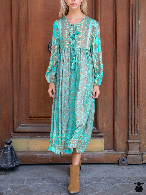 Vestido boho chic en color turquesa de mangas largas y estampado étnico bohemio con cierre de cordón con pompones en la parte delantera y cuello redondo.