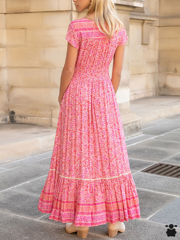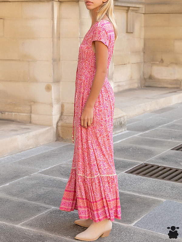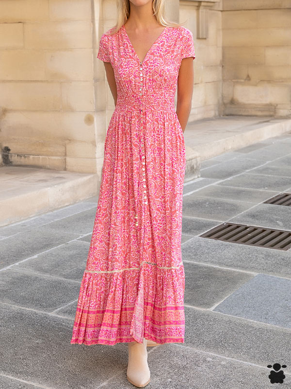 Vestido largo bohemio en color rosa con abertura con escote en V, ajustable mediante cordón y abotonados en la parte frontal.
