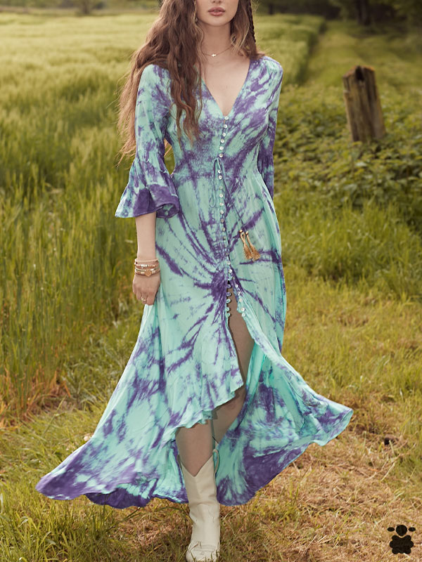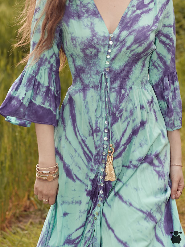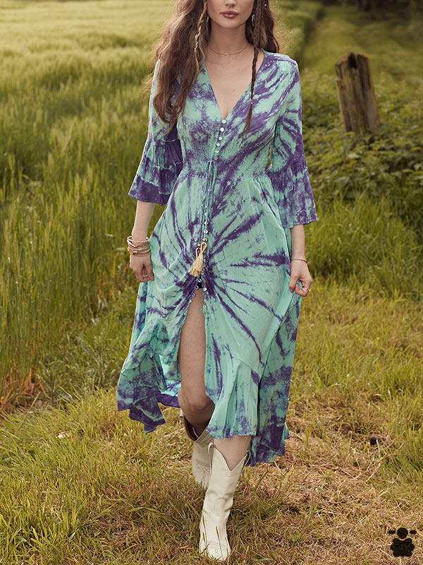 El Vestido Boho Raíz Verde Morado es una prenda que celebra la fusión entre la naturaleza y el estilo bohemio. Con un hermoso patrón tie-dye en tonos verdes y morados, este vestido largo captura la esencia libre y relajada del estilo boho. Su corte fluido, con un detalle de abertura, le da movimiento y frescura. Las mangas largas y acampanadas añaden un toque retro y romántico, mientras que el escote en V y los botones decorativos, junto al lazo con borlas doradas, le dan un toque chic y elegante. La cintura elástica permite que el vestido se ajuste cómodamente, resaltando la figura sin sacrificar la comodidad.