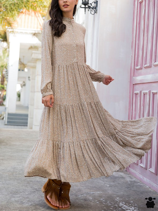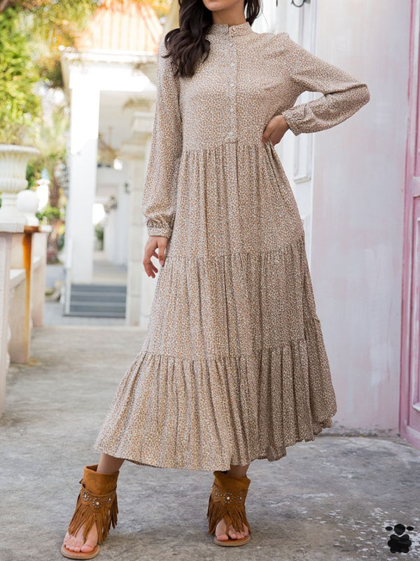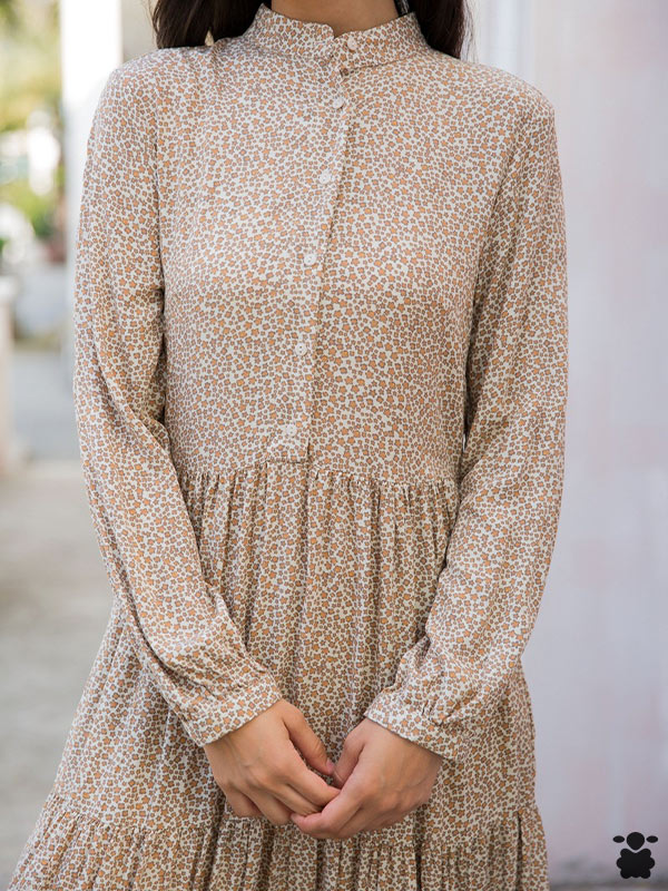 Vestido largo bohochic en color beige de mangas largas y estampado bohemio con botones en la parte delantera y cuello redondo.
